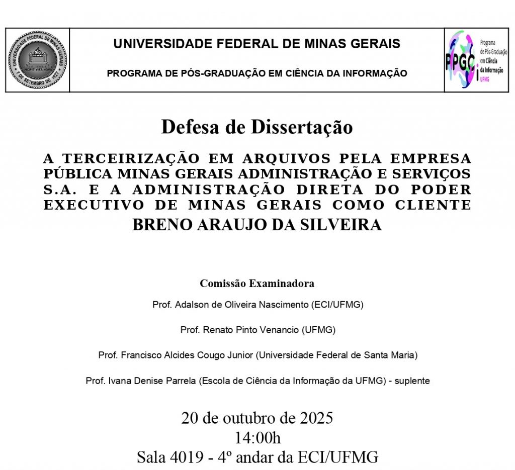 Defesa de Dissertação de BRENO ARAUJO DA SILVEIRA ”A Terceirização em Arquivos pela Empresa Pública Minas Gerais Administração e Serviços S . A . e a Administração direta do poder executivo de minas gerais como cliente”