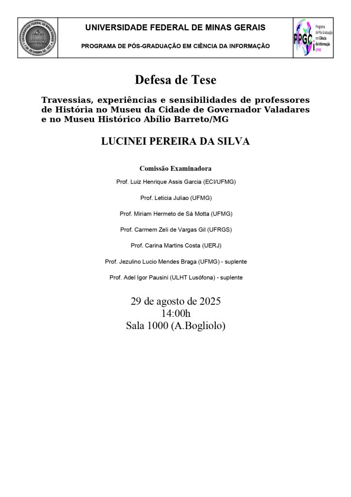 Defesa de Tese de Lucinei Pereira da Silva Travessias, Experiências e sensibilidades de professores de História no Museu da Cidade de Governador valadares e no Museu Histórico Abílio Barreto/MG Publicado em 29 de agosto de 202529 de agosto de 2025 por Diogo Algusto Resumo da defesa: https: https://ppgci.eci.ufmg.br/wp-content/uploads/2025/08/arquivo-48.pdf